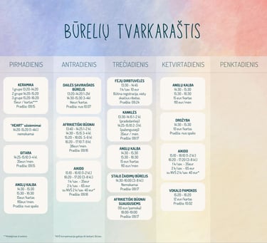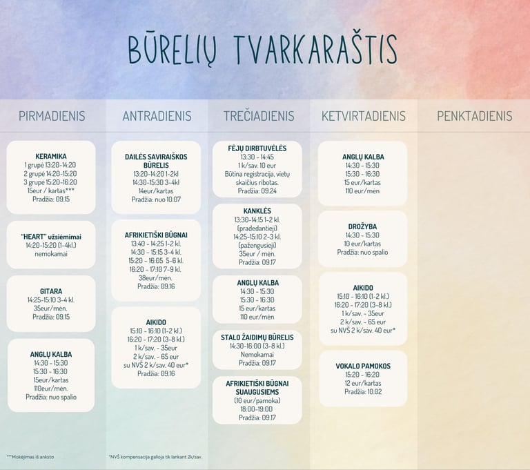 Skatiname vaikus žaisti, tyrinėti, turiningai praleisti laiką, taip pat sudarome galimybę po pamokų lankyti būrelius mokykloje. Svarbiausias principas, kuriuo vadovaujamės parinkdami neformalaus ugdymo veiklas – kad jos atitiktų Valdorfo pedagogikos prioritetus. Tai reiškia, skatintų įvairiapusį vaiko tobulėjimą pagal jo amžių, ugdytų svarbias savybes.